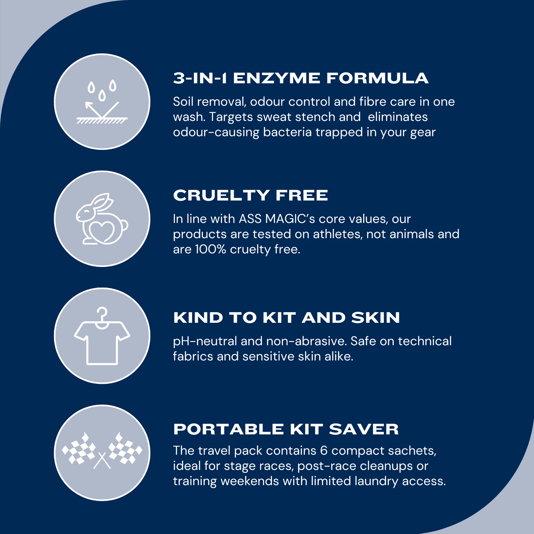 The ASS MAGIC Kit Wash Travel Pack is tailor-made for athletes on the move—cyclists, runners, triathletes—who push their limits in challenging environments. This pack contains 6 convenient 50 ml sachets, perfect for training camps, stage races, or multi-day adventures where laundry access is limited. The 3-in-1 formula removes stains, neutralizes odours, and cares for technical fabrics. It is pH-neutral, gentle on gear and skin, biodegradable, and free from phosphates and optical brighteners—offering powerful cleaning with eco-conscious integrity. No washing machine? No problem—just dissolve in water, soak, rinse, and hang to dry.