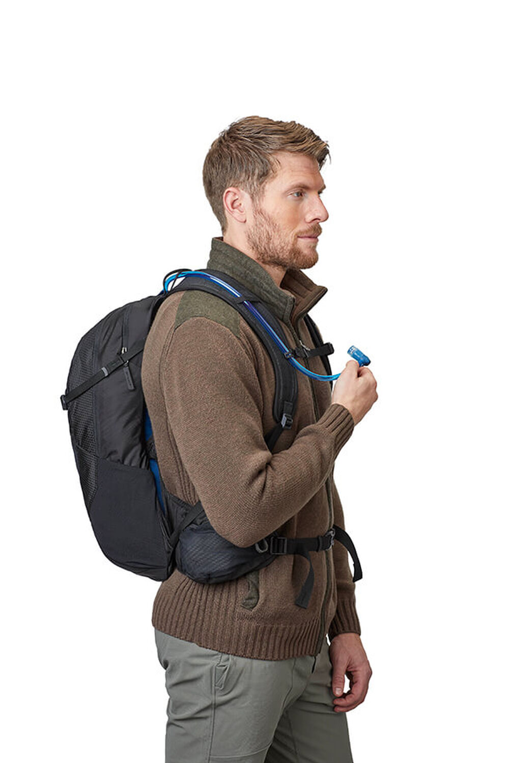 - Breathable shoulder harness with magnetic sternum buckle and hose clip for the reservoir bite valve