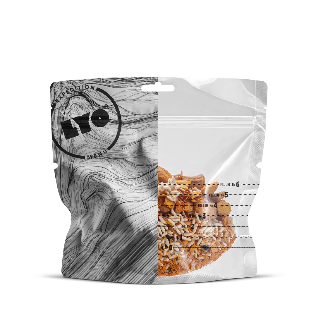 Μεγάλη διάρκεια ζωής: Τα γεύματα LYO EXPEDITION μπορούν να αποθηκευτούν για μεγάλο χρονικό διάστημα. Δεδομένου ότι η περιεκτικότητα σε νερό αφαιρείται κατά τη διάρκεια της διαδικασίας ξήρανσης με κατάψυξη, οι μικροοργανισμοί και η δράση των ενζύμων αναστέλλονται. Κάθε σάκος σφραγίζεται ερμητικά και περιέχει απορροφητή οξυγόνου.