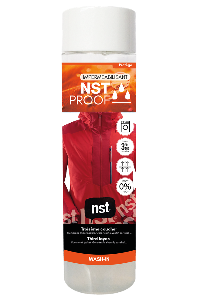 Το NST Proof είναι μια υδατοαπωθητική επεξεργασία για όλα τα αθλητικά ρούχα και εξοπλισμό που απαιτεί αντικατάσταση DWR (υδατοαπωθητικό). Μείνετε άτρωτοι στην υγρασία στα ρούχα σας. Διαποτίζει τις ίνες στον πυρήνα και αφήνει στην επιφάνεια ένα προστατευτικό φιλμ που απωθεί το νερό και τους λεκέδες.