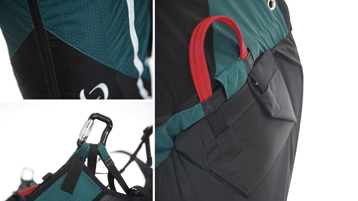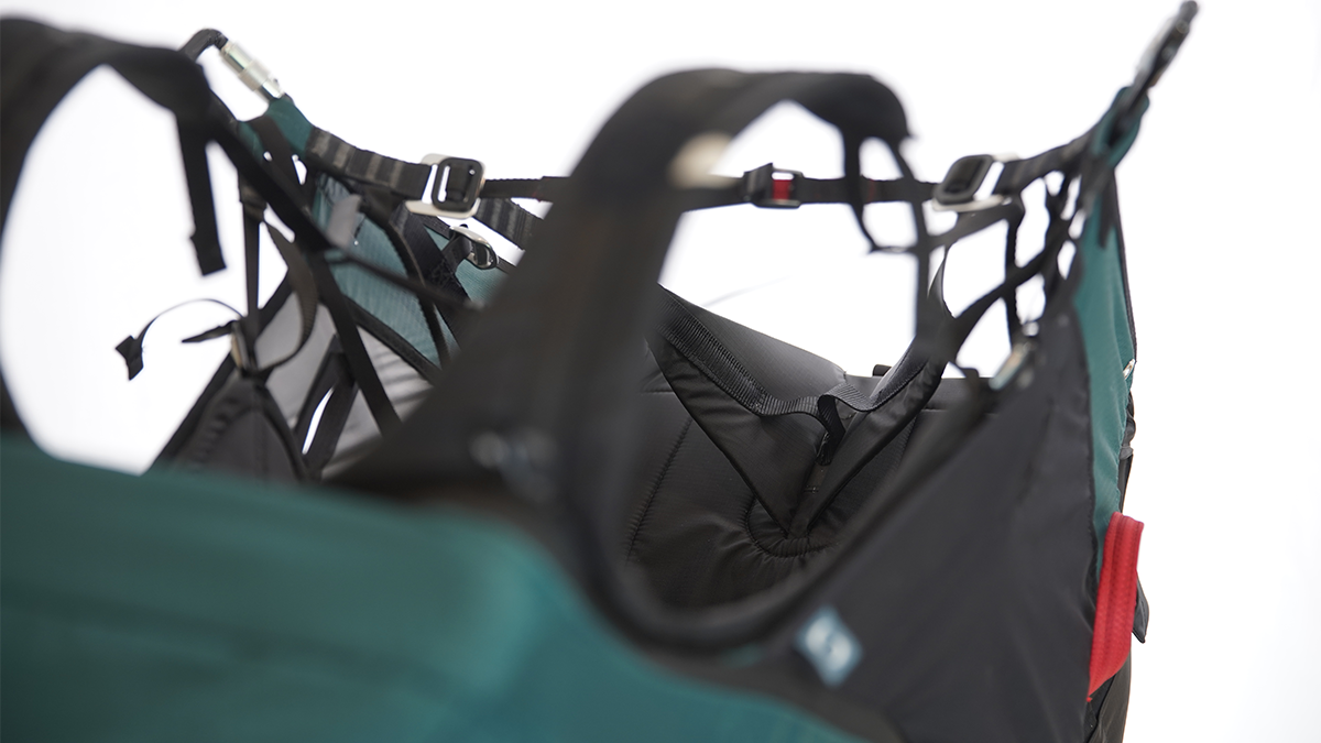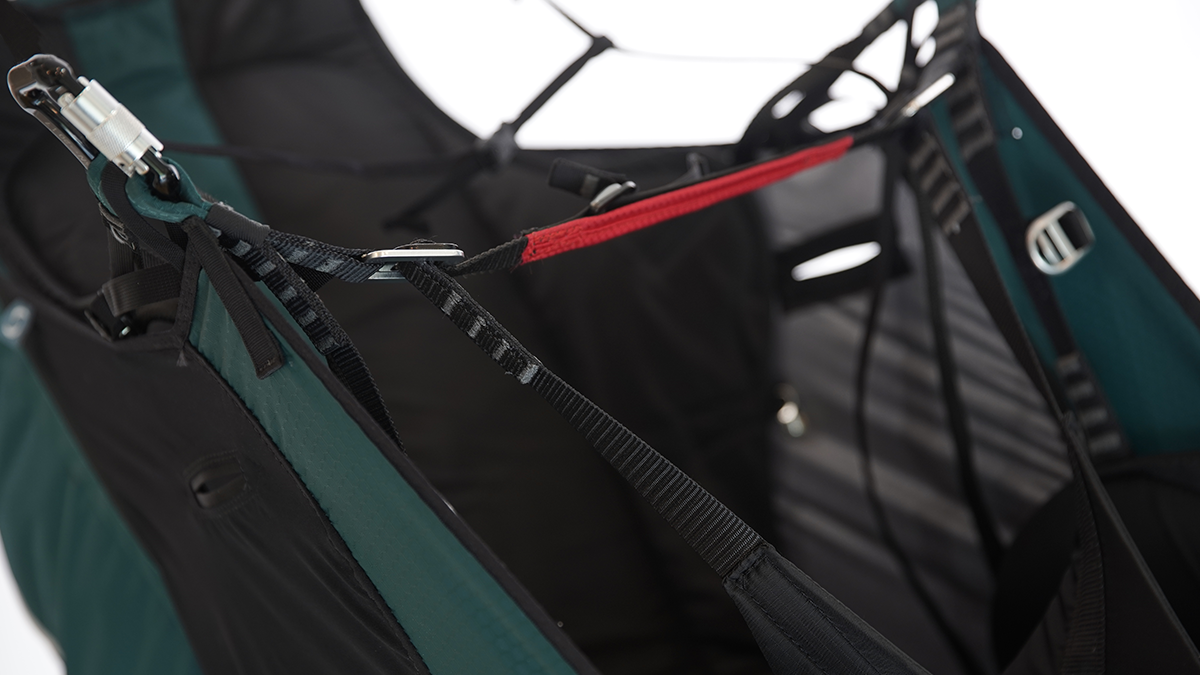 Υβριδική δομή με τα πλεονεκτήματα της πλεξούδας με την πλάκα του καθίσματος και το σχέδιο «split-leg», που επιτρέπει μεγάλη άνεση καθώς και μια ευχάριστη συμπεριφορά πτήσης: «ωραίο & εύκολο». Η στερέωση της ζώνης γίνεται με δύο πόρπες (πλαίσιο / περαστικό). Γρήγορο, εύκολο και ασφαλές!